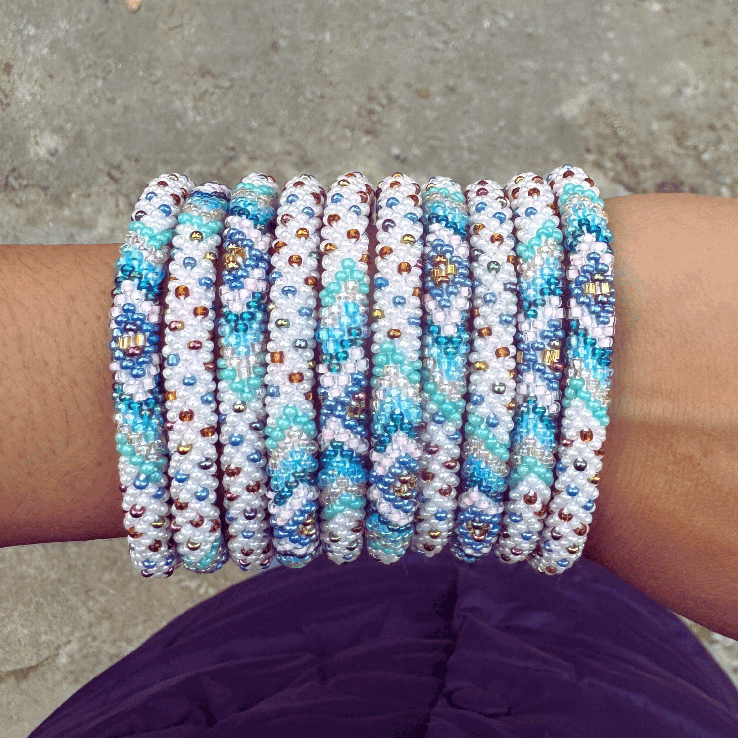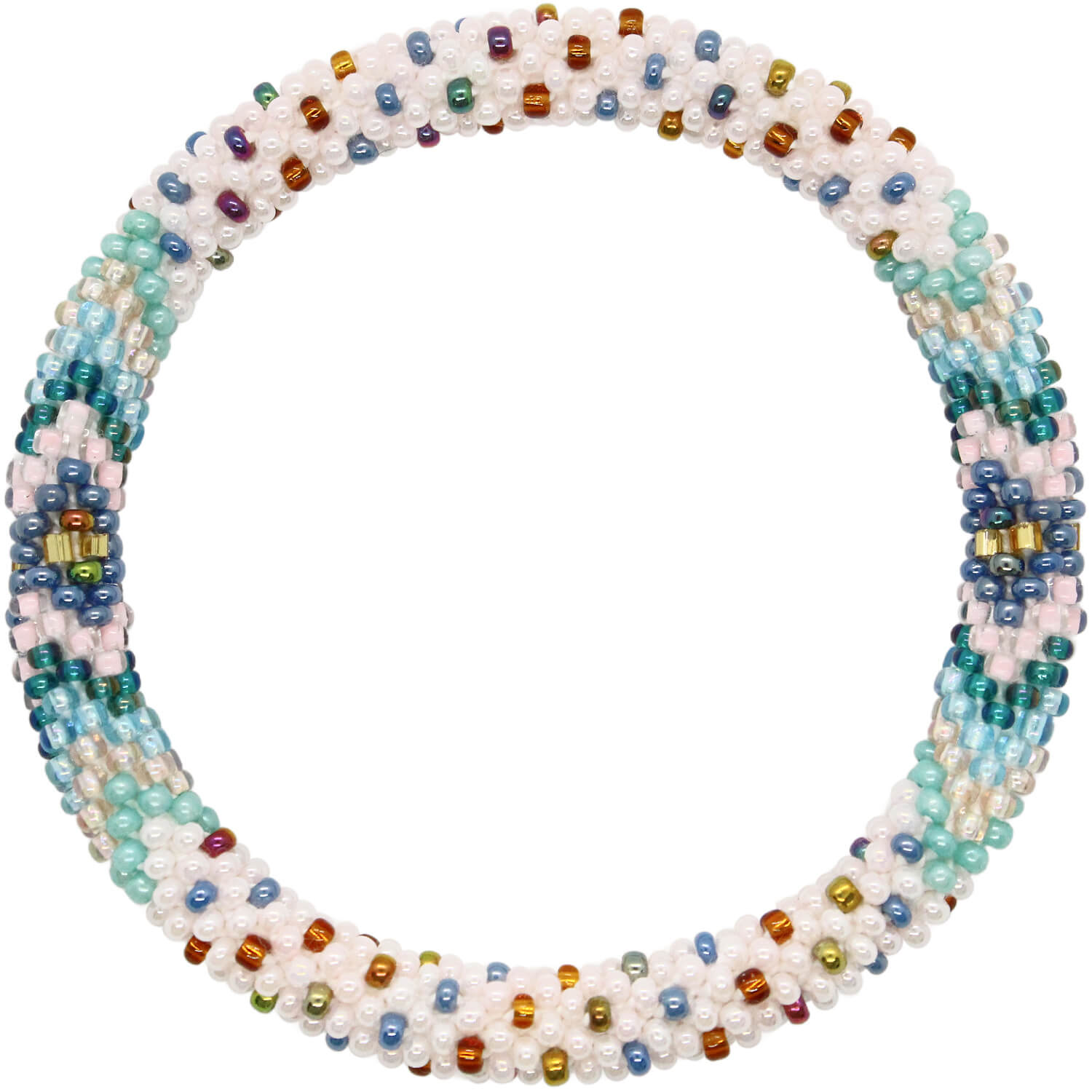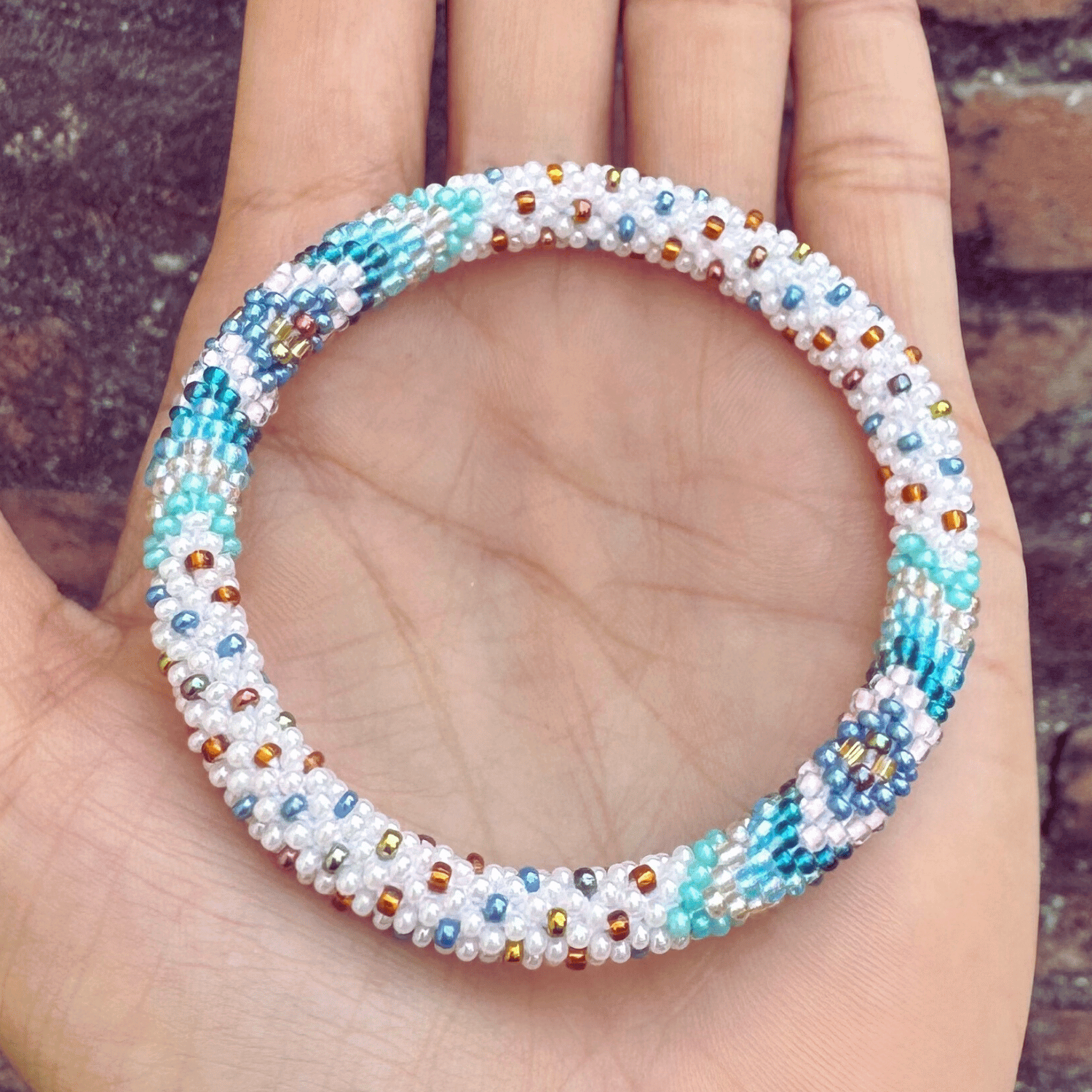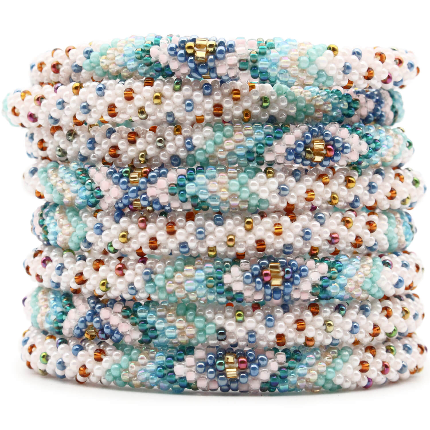 Each glass seed bead is crocheted into a seamless tubular structure — flexible, metal-free, and delightfully comfortable — perfect for stacking and designed to fit a wide range of wrists (including plus-size jewelry lovers). Many of our customers also appreciate the soft structure as an arthritis-friendly option.